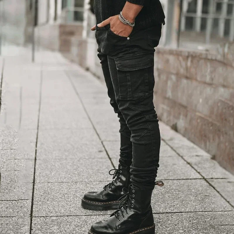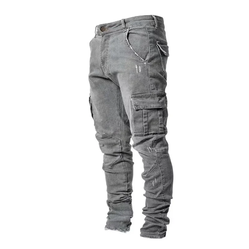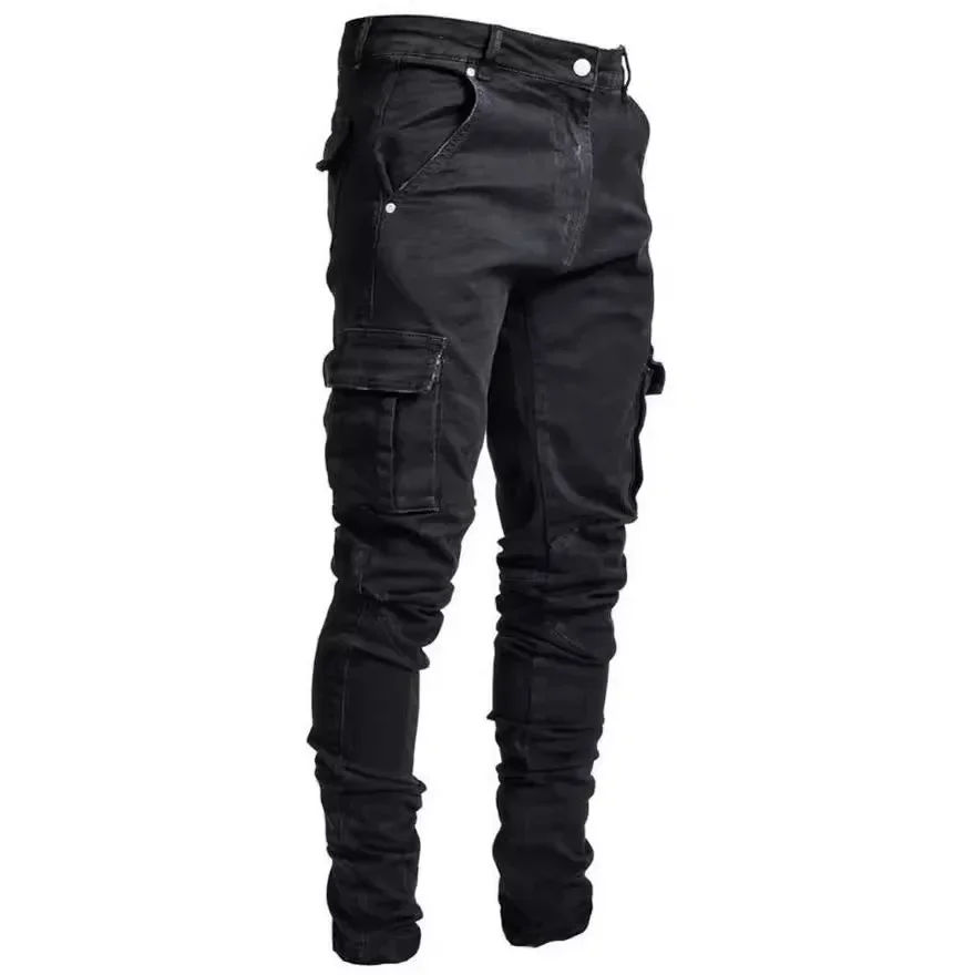 الرجال الشارع مطاطا الدينيم الجينز غسل بلون متعدد جيوب البضائع السراويل عادية سليم صالح ارتداء اليومي ركض منتصف الخصر بنطلون