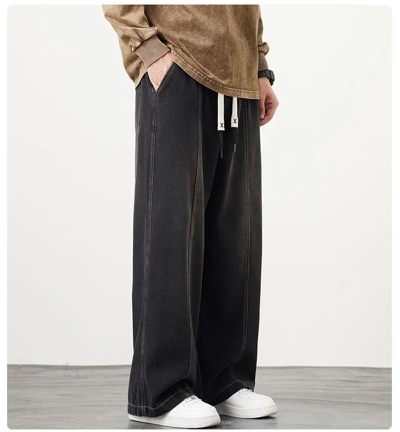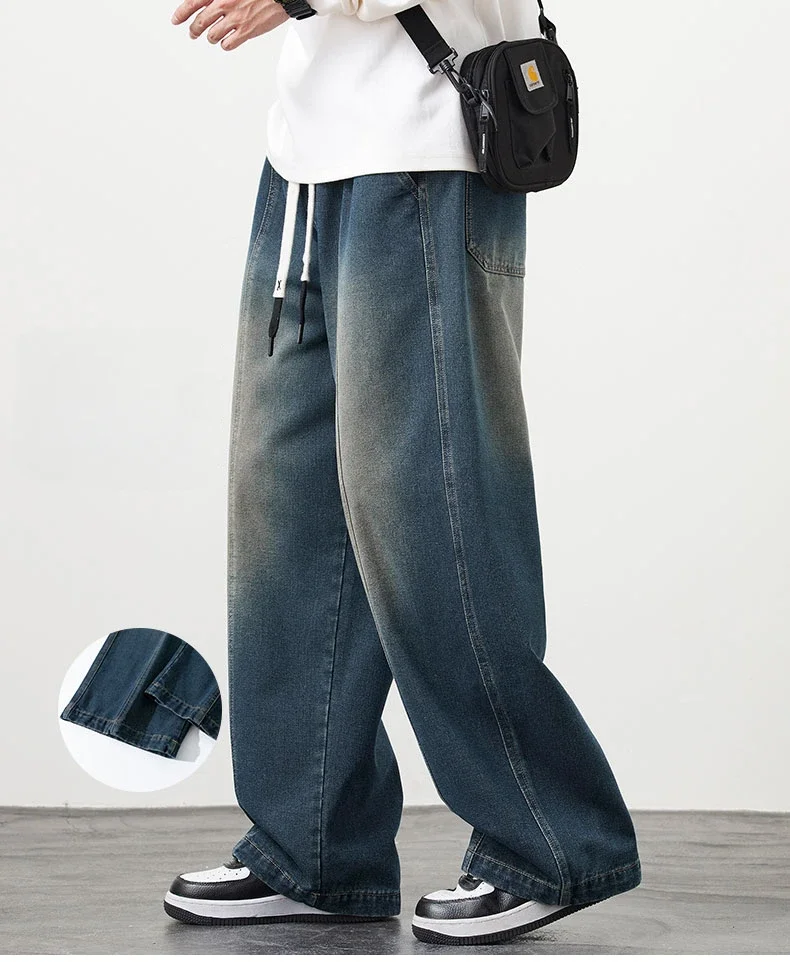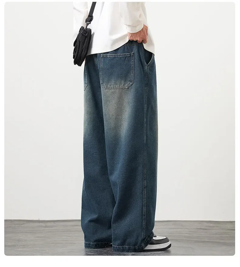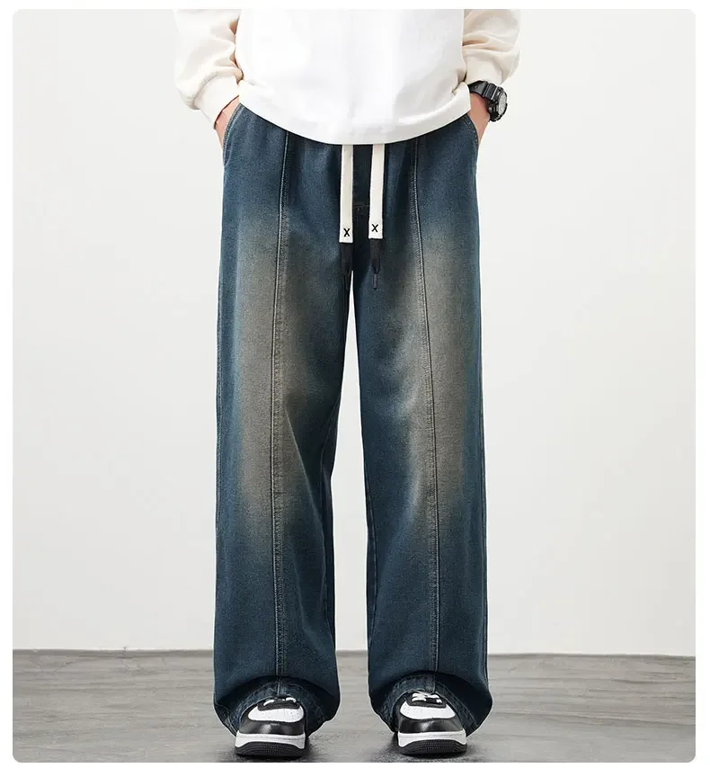 الرجال جديد فضفاض الجينز موضة Y2K شارع العليا الرجعية الأزرق بنطلون مطاطا الرباط مستقيم واسعة الساق فضفاض عادية الدينيم السراويل